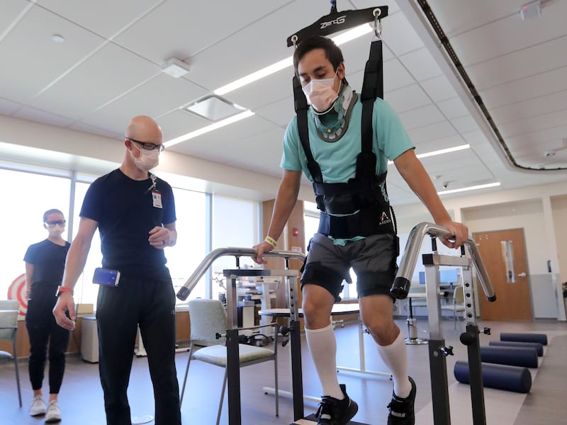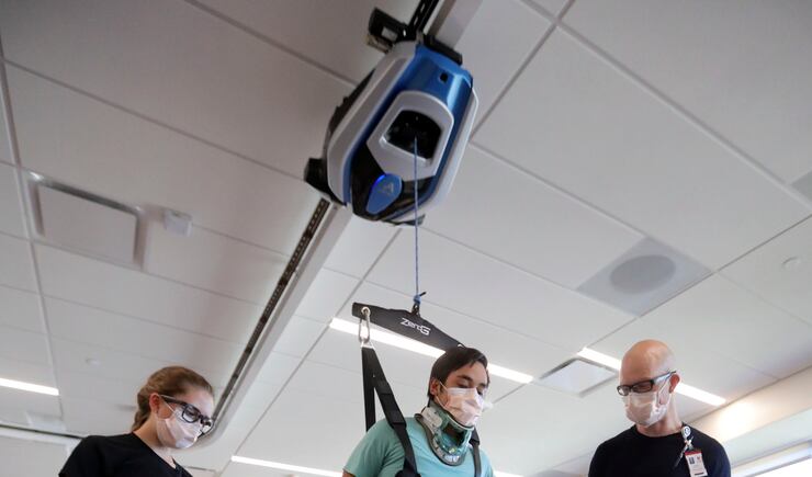Fast forward just four weeks, and Sugihara is walking, with the help of a ZeroG Gait and Balance System at University of Utah Health’s new Craig H. Neilsen Rehabilitation Hospital, the first of its kind in Utah. Therapists there say Sugihara will walk out on his own in a little less than two weeks.