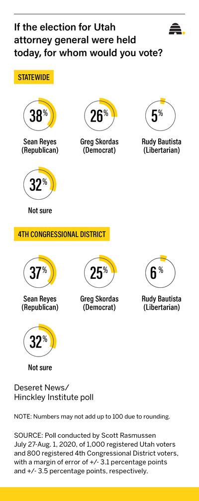 If the election were held today, 38% of Utahns would vote for Reyes, 26% for Skordas and 5% for Libertarian Rudy Bautista, according to a new Deseret News/Hinckley Institute of Politics poll. But the survey of 1,000 registered voters found 32% aren’t sure who they would choose.