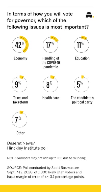 Most Utahns polled, 42%, said the economy is the most important issue to consider in the governor’s race, followed by the handling of COVID-19 at 17%; education at 11%; taxes and tax reform at 9%; health care at 8%; political party at 5%; and other at 7%.