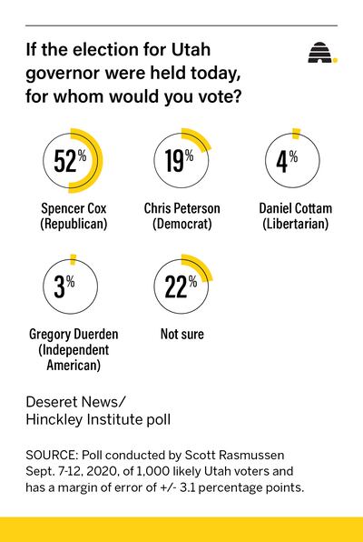 A majority of the state’s likely voters, 52%, said they would choose Cox if the election were held today, while 19% said they’d cast their ballot for Peterson, a University of Utah law professor and first-time candidate.