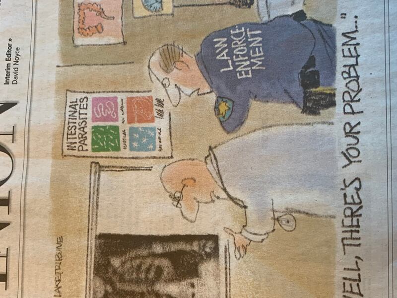 Pyle further said that the officer in the cartoon “has rightly gone for a checkup because he felt that something was wrong. He is clearly not pleased with what he is seeing in the X-ray and, having seen it, may well resolve to take appropriate action. At least we can hope.”