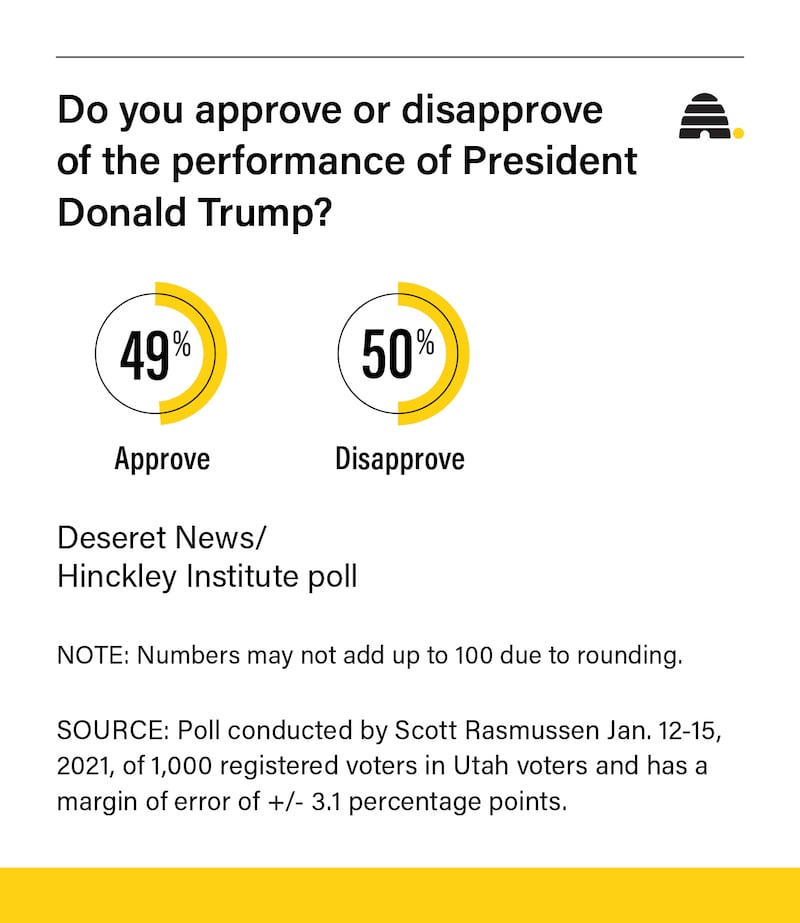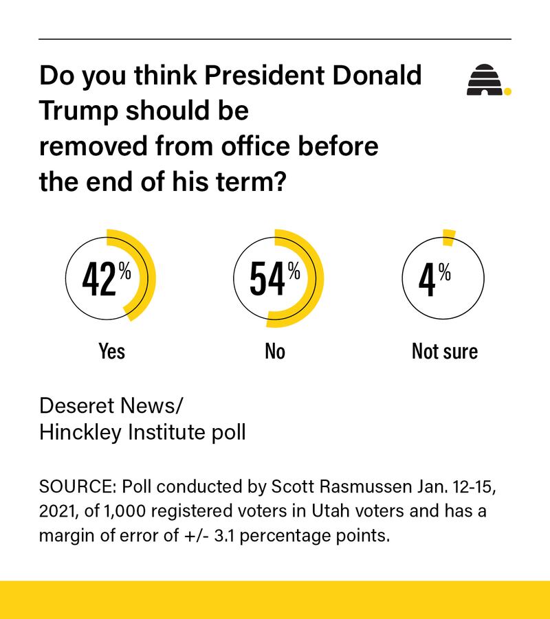 In the Deseret News/Hinckley Institute poll, 54% of Utahns say Trump — whom the House impeached last week for inciting an insurrection — should not be removed from office before his term ends. Another 42% say he should be removed.