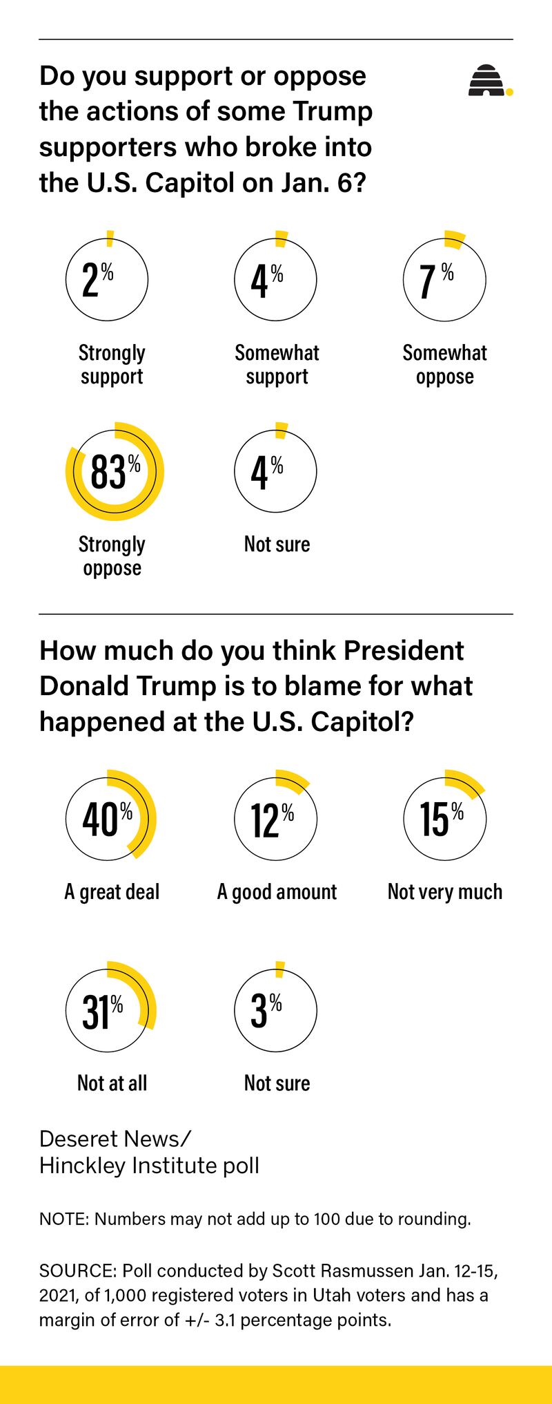 A new Deseret News/Hinckley Institute of Politics poll found 40% of residents in the state say Trump is a great deal to blame for what happened on Jan. 6, while 31% say he is not at all to blame.