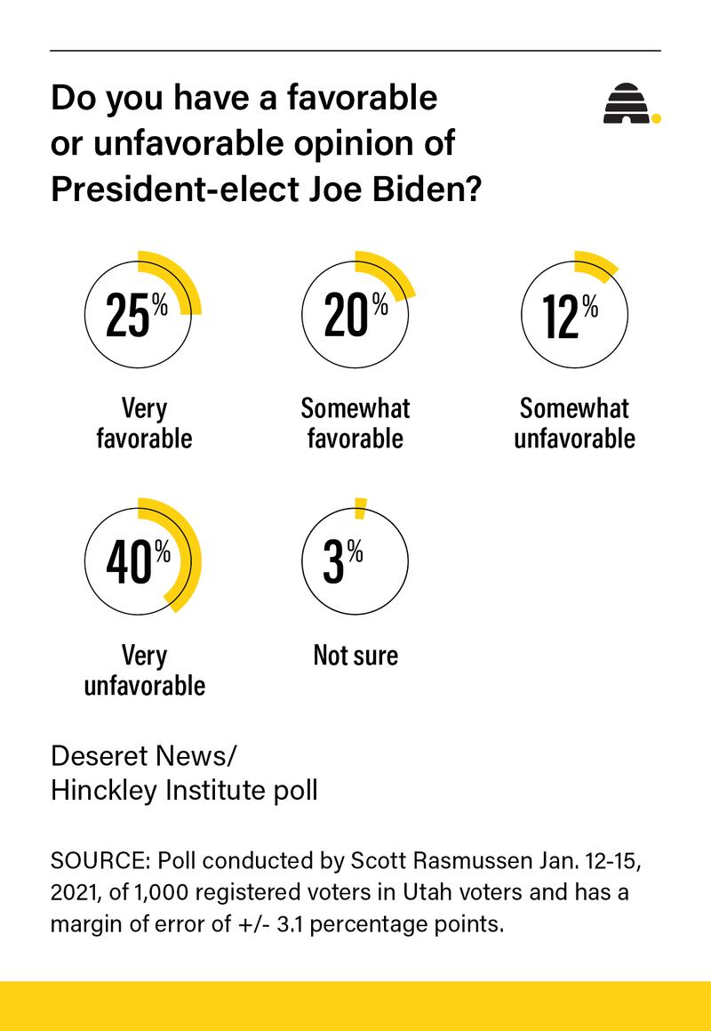 A new Deseret News/Hinckley Institute of Politics poll found 52% of residents have an unfavorable opinion — including 40% very unfavorable — of the new president. The survey shows that 45% of Utahns have a favorable opinion of Biden, while 3% aren’t sure.