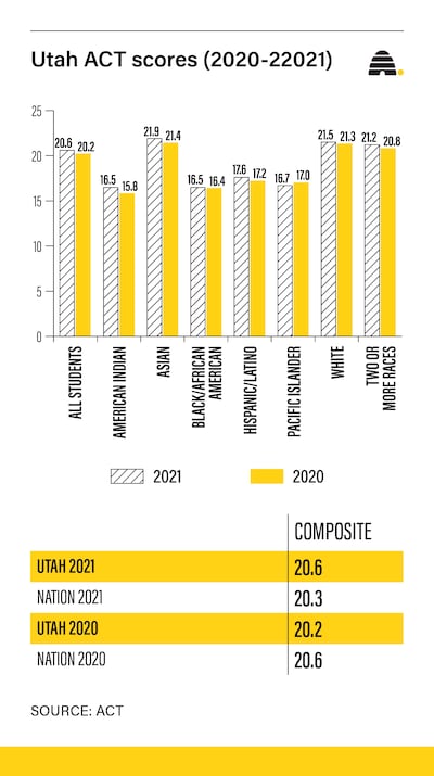Utah students’ average composite scores on the ACT college entrance exam climbed between 2020 and 2021, rising from 20.2 to 20.6, but numbers of students who took the test fell by 11% from the previous year.