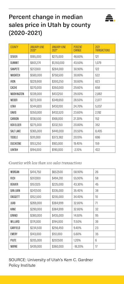 Those areas saw the highest percent change in median sales price of homes among Utah’s counties with more than 100 sales transactions from January 2020 to June 2020, and January 2021 to June 2021, the report states.