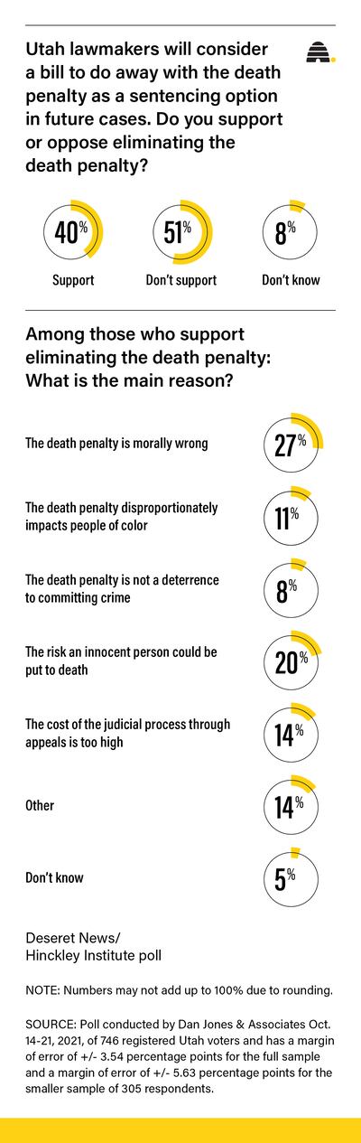 A very slight majority of Utahns — 51% — oppose eliminating Utah’s death penalty as a sentencing option in future cases compared to 40% who support doing away with it, according to a new Deseret News/Hinckley Institute of Politics poll. About 8% said they didn’t know what to think.