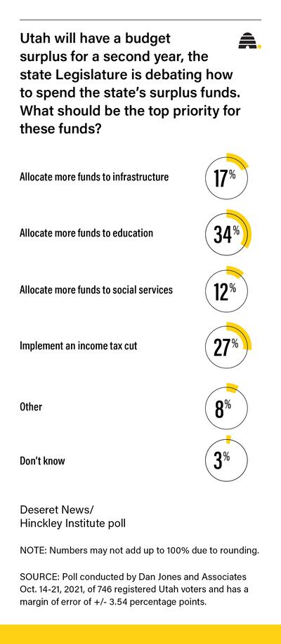 More than one-third of Utahns say education should be the Utah Legislature’s top priority for an anticipated budget surplus, a new poll conducted for the Deseret News/Hinckley Institute of Politics shows.