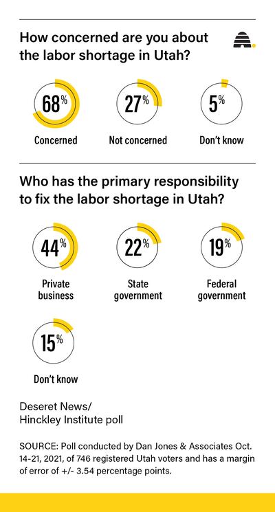 The Deseret News/Hinckley Institute of Politics poll conducted earlier this month found 68% of surveyed Utah voters are concerned about the number of unfilled jobs while 27% identified themselves as not concerned about the issue and 5% were unsure of their stance. The results are from polling of 764 registered Utah voters and have a 3.54% margin of error.
