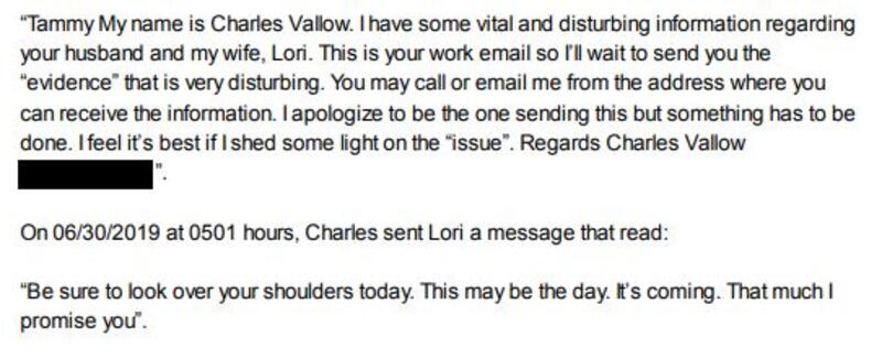 “Tammy my name is Charles Vallow. I have some vital and disturbing information regarding your husband and my wife, Lori. This is your work email so I’ll wait to send you the ‘evidence’ that is very disturbing. You may call or email me from the address where you can receive the information. I apologize to be the one sending this but something has to be done. I feel it’s best if I shed some light on the ‘issue.’ Regards Charles Vallow.”