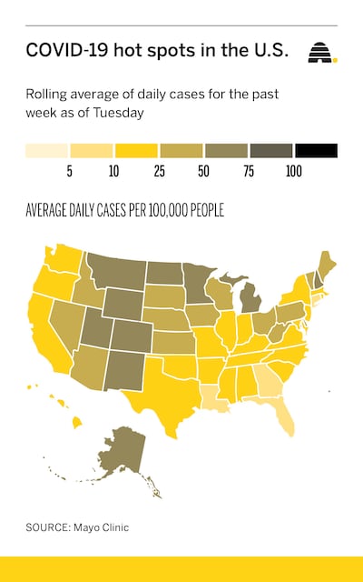 All five states — Utah, Montana, Wyoming, Colorado and New Mexico — are averaging more than 50 new cases a day per 100,000 residents, according to data collected by the Mayo Clinic. Only five other states nationwide are hitting that level, North Dakota, Minnesota, Michigan, New Hampshire and Alaska.
