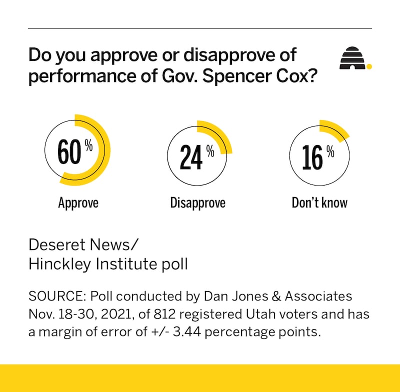 The poll conducted last month is the latest of a series of Deseret News/Hinckley Institute of Politics polls that have gauged Utahns’ feelings about Cox throughout the year. Cox’s approval ratings peaked at 66% in March, lingered at 65% in April, then dropped slightly to 58% in June. That latter poll was conducted June 18-25 by Scott Rasmussen of 1,000 registered Utah voters and had a margin of error of plus or minus 3.1 percentage points.