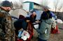 A couple of volunteers offer to help them push and pull the load they are struggling to move alongside the muddy tracks. One woman asks where they are going.
