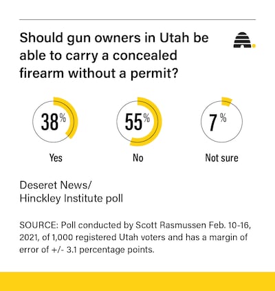 But 55% of Utahns say gun owners should not be able to carry and cover their firearms without a license, according to a new Deseret News/Hinckley Institute of Politics poll.