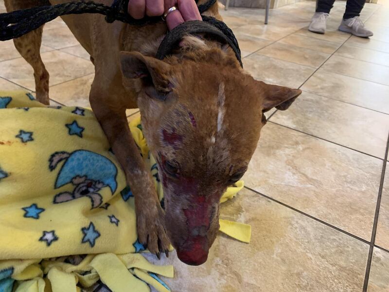 Animal Services spokeswoman Callista Pearson gave an update on the dog Tuesday, saying she was stable but still in critical condition with second- and third-degree burns primarily on her head and neck and inside her mouth, as well as burns on her pelvis and hind legs.