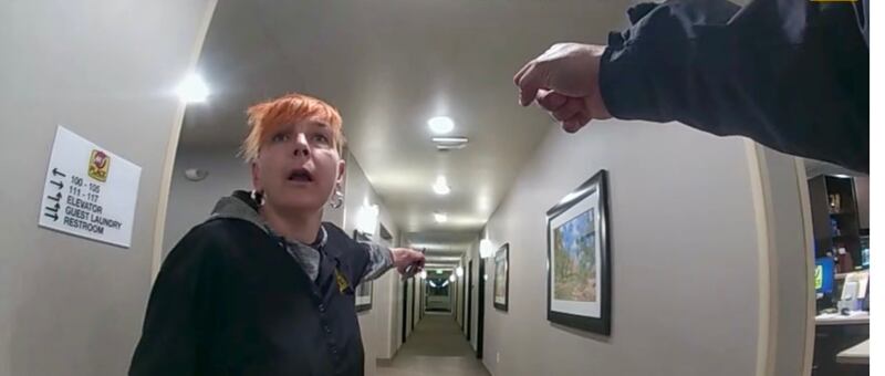 Carlson is then heard on his body camera telling Blackmore, “I don’t appreciate you swearing at me” and again tries to convince her that he is standing in the hotel lobby. When he gets off the phone, Carlson tells the other officer, “She’s like cussing me out ... saying she’s not going to come down.”