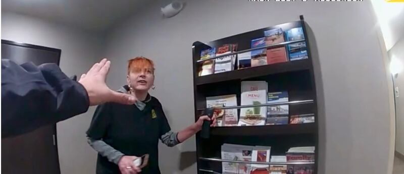 The officers then had the hotel guest who was locked out call Blackmore. A few moments later, she is seen walking toward him from a first floor hallway and immediately states, “I want you gone. Right now. If he can get in to that door, he can get in to that door,” while motioning to a room door. “I want him out. Go away.”