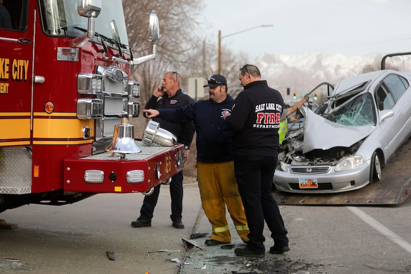 SALT LAKE CITY — A car crashed into a fire engine in Salt Lake City Monday afternoon, injuring three people including two firefighters, the city’s fire department confirmed.
