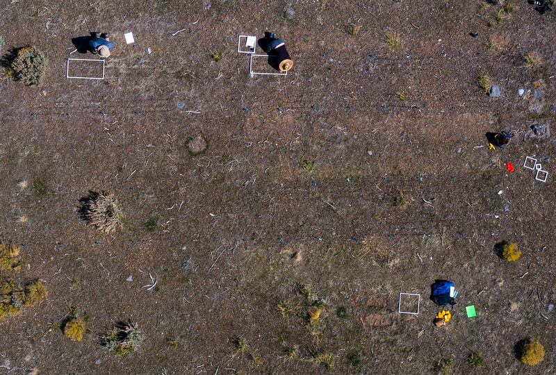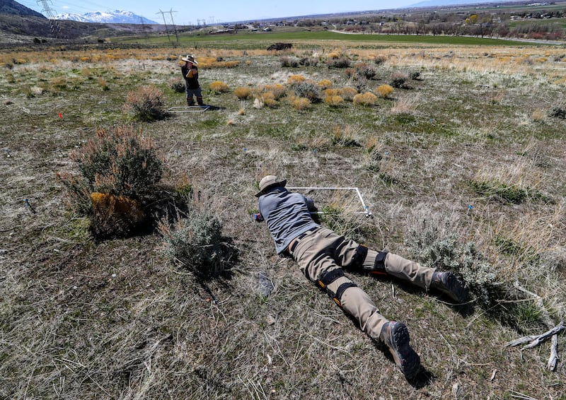 Eshleman’s and Donovan’s seeds were planted last fall to learn how best to restore native grasses to Western states. They used gridded structures made of PVC piping to carefully and painstakingly search for sprouted natural grasses among the weed-infested ground of Utah Division of Wildlife Resources land north of Ogden.