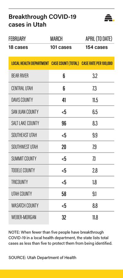 Breakthrough cases are climbing in the state, according to data provided by the Utah Department of Health. Just 18 Utahns tested positive for the virus at least two weeks after their final vaccine dose in February; but there were 101 breakthrough cases in March and 154 so far in April, with 41 new cases reported since April 22.