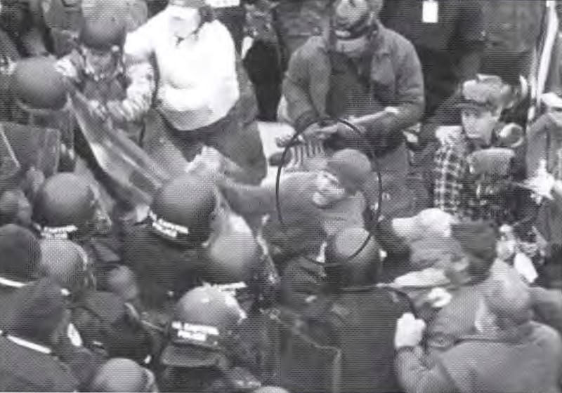 “From behind, Copeland pushed that unknown person into the officer, and the officer appeared to fall to the ground. Other officers, bearing riot shields, pushed forward against the crowd in an apparent attempt to protect the fallen officer. Copeland grabbed one of the riot shields and pushed back against the police line. He also grabbed at an officer’s jacket and pushed that officer backward. Then he lowered his body to block officers as they advanced. After a brief struggle, the police forced Copeland back,” according to the complaint.