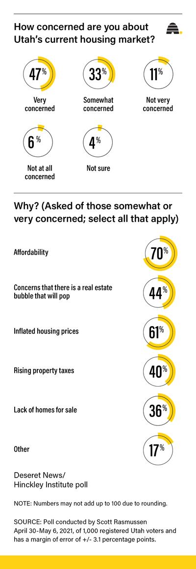 That’s according to a new Deseret News/Hinckley Institute of Politics poll, which found 47% of Utahns say they’re “very concerned” about Utah’s current housing market, while 33% said they are “somewhat concerned.”