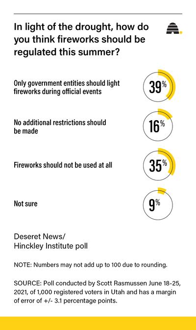 Asked how they think fireworks should be regulated this summer in light of the drought, 39% of Utahns said only government entities should light fireworks during official events, and almost as many — 35% — said fireworks should not be used at all this year.