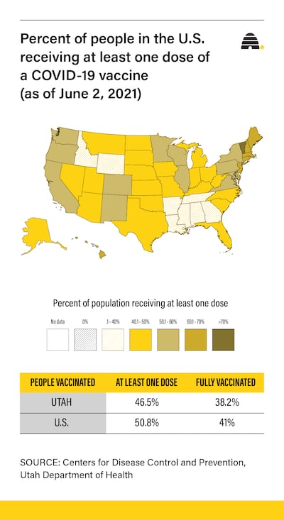 When it comes to being fully vaccinated against the coronavirus, meaning it’s been at least two weeks since the final dose, the difference between Utah and the United States shrinks slightly, with 38.5% of Utahns reaching the milestone met already by 41.4% of Americans.