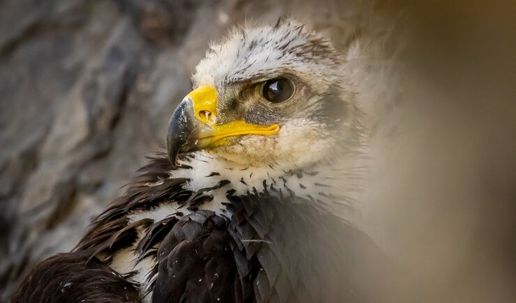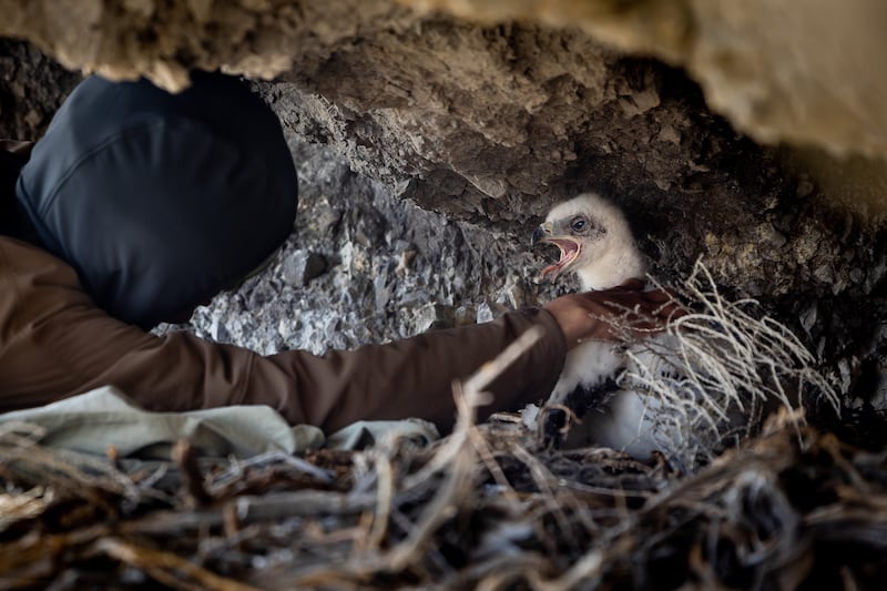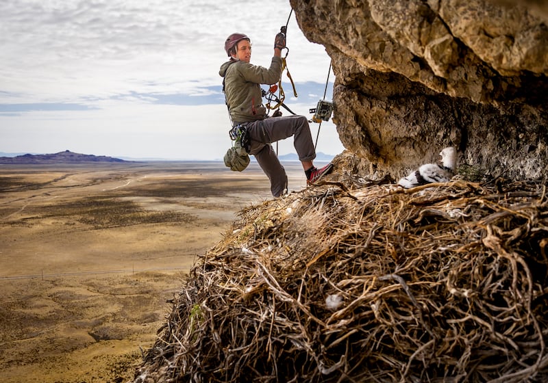 I lower myself onto a rocky ledge below, waiting for one of Maloney’s fellow biologists to descend to put the bird back in its nest. The ledge above me is strewn with loose rock, so I’ve opted to wait by the nest while the scientists draw blood samples and gather other data from the bird atop the cliff. Letting some slack out of my rope, I’m able to shuffle into the sun to stay warm on a strangely cool and windy May morning in the western desert, and there I wait for my next shot.