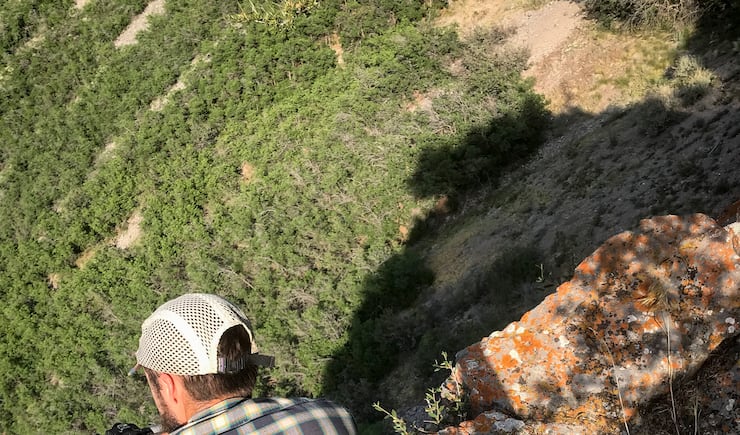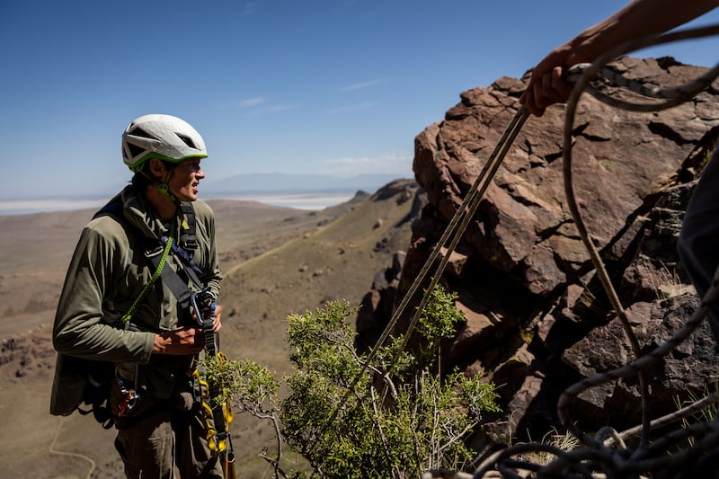 On another trip to a nest site in Tooele County, we found two nestlings, but they had walked out onto a narrow ledge away from their nest. Maloney was afraid that an attempt to gather them could lead to them trying to jump to the ground below, or leave a member of his team at risk of swinging against the rock, so he decided the data wasn’t worth the risks to bird and human.
