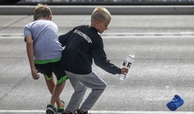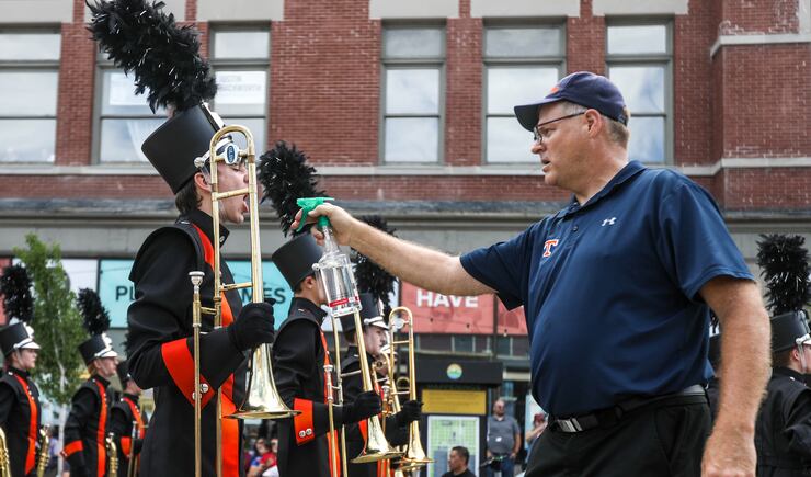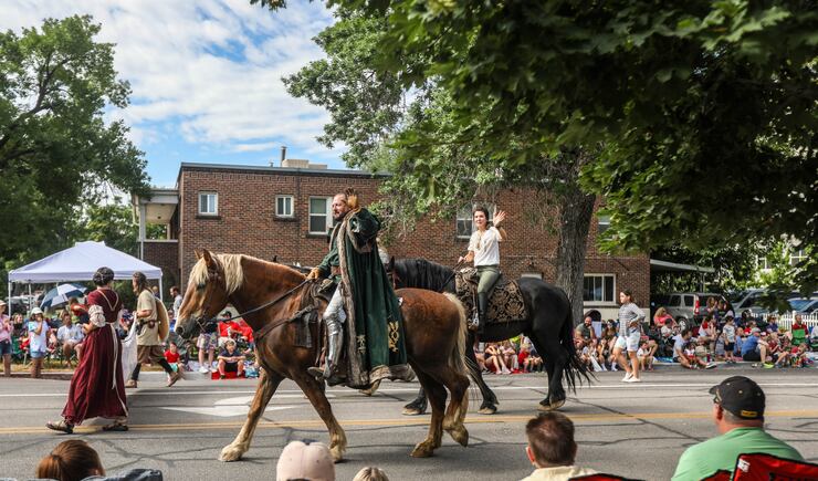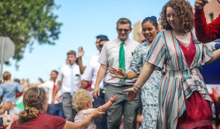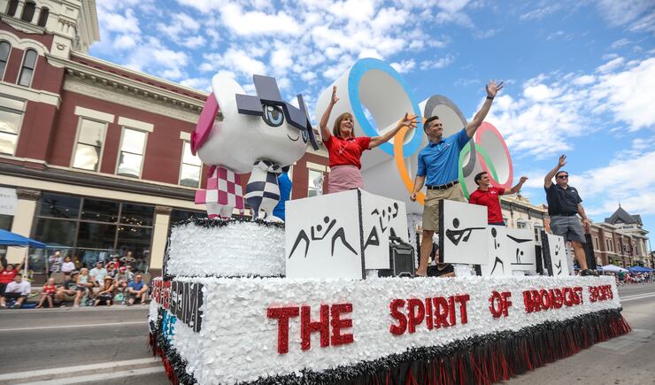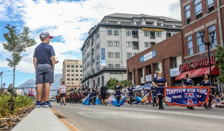 At Provo's Freedom Festival, colorful parade floats rolled down the street and Utah Valley University cheerleaders and other performers made their way along the route as onlookers applauded, many from under pop-up tents. Former Gov. Gary Herbert gave a thumbs up and his wife, Jeanette Herbert, a wave from a limousine-style Forde Model T as the parade's grand marshals.