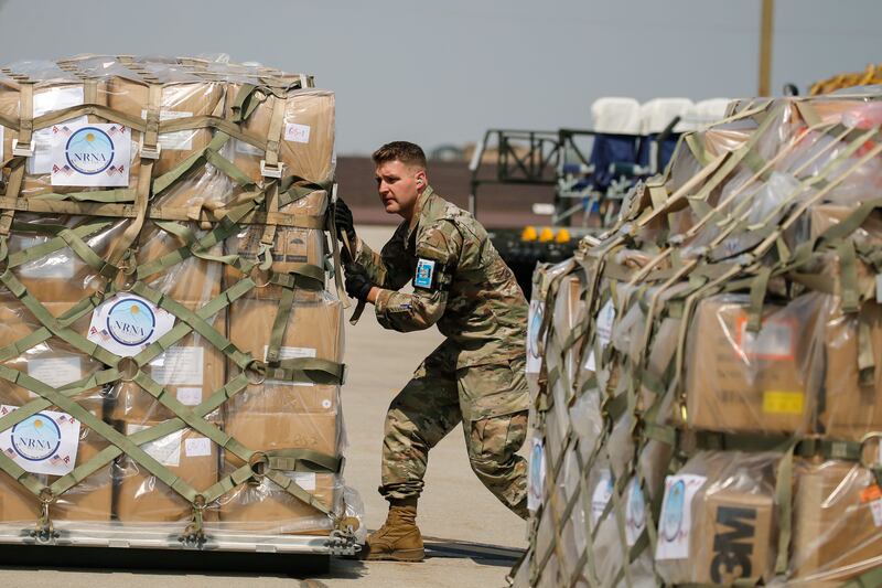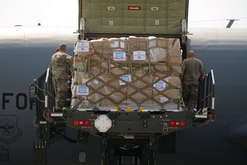 Members of the Utah Air National Guard’s 151st Air Refueling Wing on Tuesday loaded lifesaving equipment and humanitarian COVID-19 supplies bound for Kathmandu, Nepal, aboard a KC-135 at Roland R. Wright Air National Guard Base in Salt Lake City.