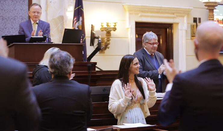 Rep. Jon Hawkins, R-Pleasant Grove, introduced the four gymnasts — all current or former members of the University of Utah Red Rocks gymnastics team — on the House floor, saying he was “honored” to recognize their “phenomenal accomplishments.”