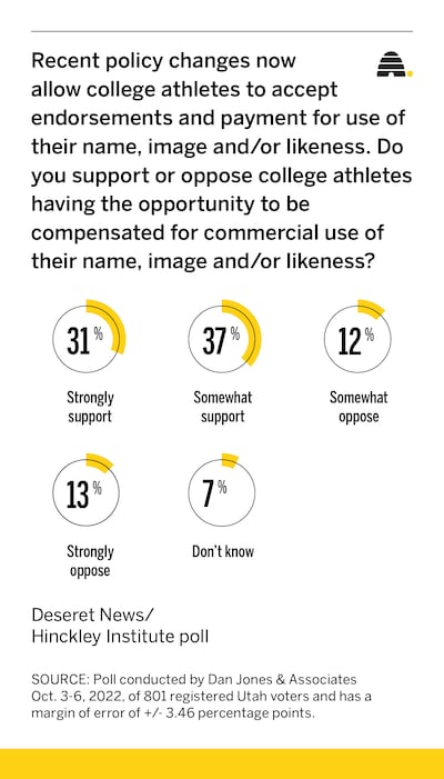 More than two-thirds of Utahns support college athletes having the opportunity to be compensated for commercial use of their name, image and/or likeness, according to a new poll commissioned by the Deseret News and the Hinckley Institute of Politics.