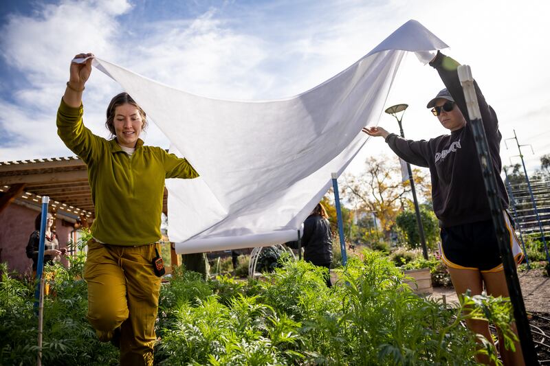 Employees at Wasatch Community Gardens were taking precautions on Friday, taking care to cover marigolds in advance of the storm.