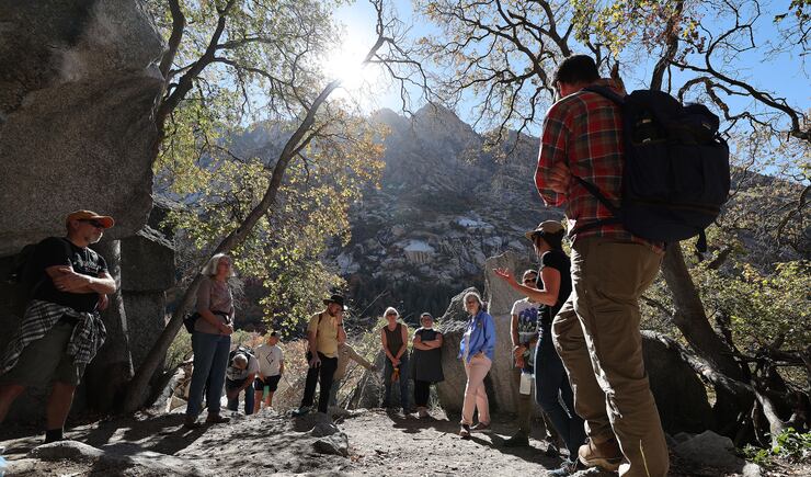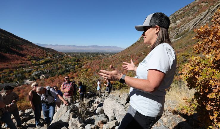 Walking up the steep switchbacks carved into the mountainside, the group stopped after a half-mile, overlooking the small parking lot at the bottom of the canyon and the adjacent neighborhoods, surrounded by the fiery maze of scrub oak and cottonwood trees.