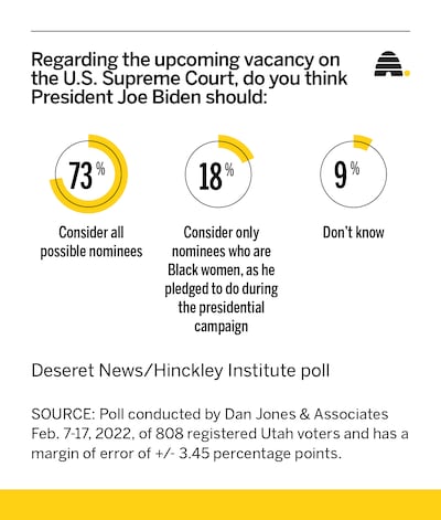 Utahns were divided along political ideology, with an overwhelming majority of conservatives wanting Biden to consider all nominees and liberals favoring his vow to choose a Black woman.