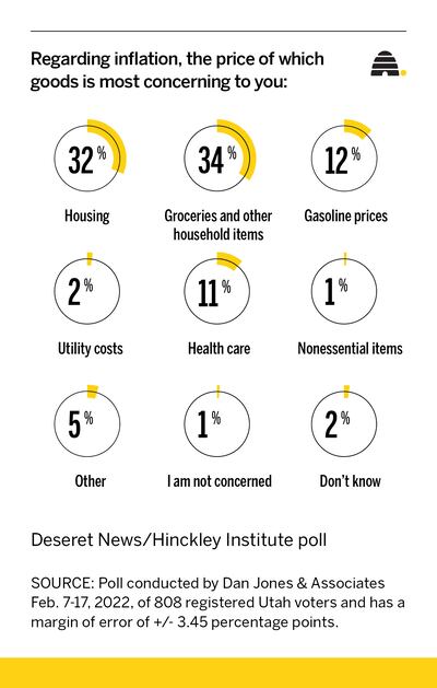 The findings are from a new Deseret News/Hinckley Institute of Politics poll that found inflation was the No. 1 economic concern for Utahns with 50% of respondents rating it as the most pressing fiscal challenge. Housing costs were the next biggest economic woe with 27% giving it top billing.