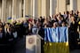 Dozens of Utah lawmakers also stood on the steps, at one point unraveling and standing under rolls of paper to represent Ukraine’s flag.