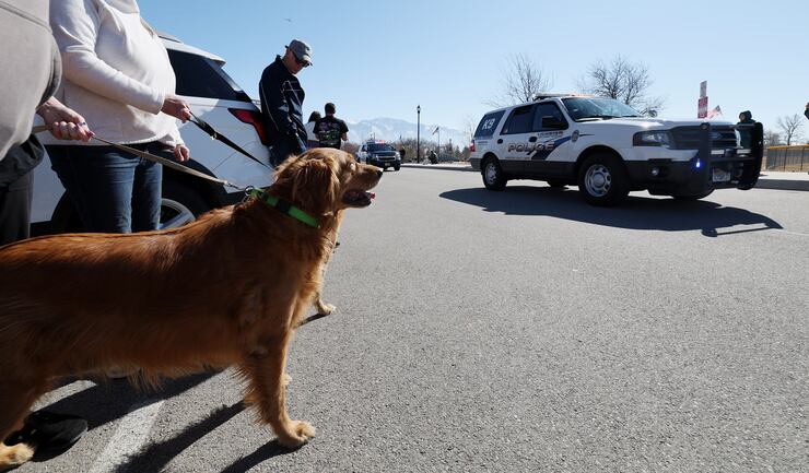 At West Jordan Veterans Memorial Park, 1985 W. 7800 South, dozens of members of the public — many who brought their own dogs and waved American flags or flags with a thin blue line — lined the sidewalk as the long procession went through the park and under a West Jordan fire truck draping a U.S. flag from its extended ladder.
