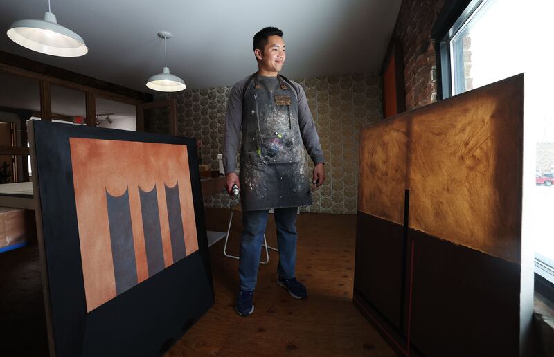 Across the way from Wilson, in a west-facing studio, Kheng Lim is busy at work in a different style that examines the relations between opposites in color field abstraction with oil on canvas.