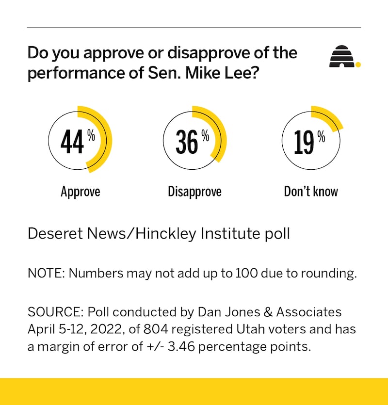 A new Deseret News/Hinckley Institute of Politics poll conducted April 5-12 found 44% of voters approve of Lee’s performance, two points higher than in a February survey. The poll found 36% of Utahns disapprove of the job he is doing, while 19% don’t know. Overall, Lee’s approval rating has not changed much since January 2021.