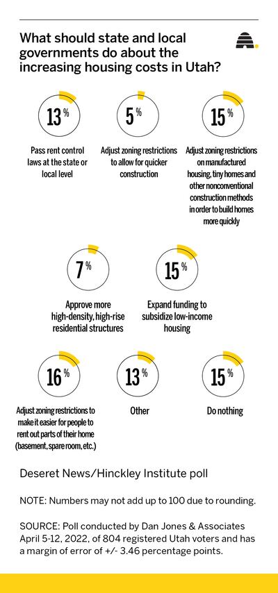 Utahns have wide-ranging opinions, with answers that run the gamut — from rent control to doing nothing — but no one stand-out solution, according to a new Deseret News/Hinckley Institute of Politics poll.