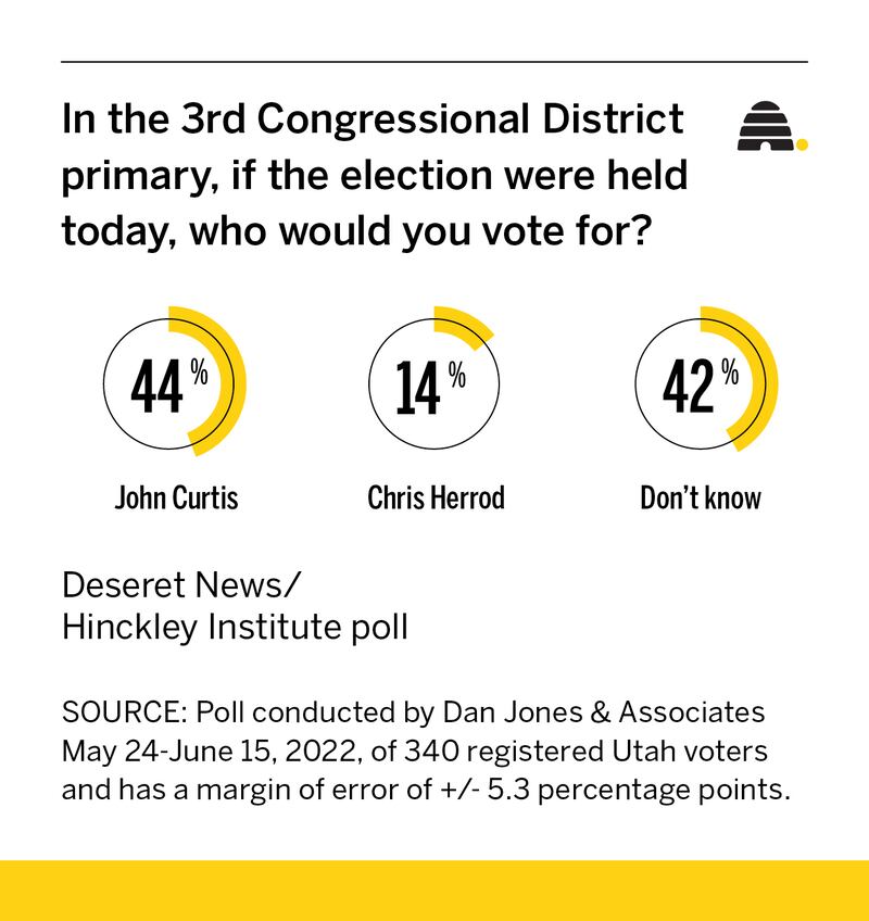 In the 3rd Congressional District, Rep. John Curtis, who has held the seat since 2017, leads challenger Chris Herrod 44% to 14%, though 42% were undecided, the polls shows. This is the third time Curtis and Herrod have faced each in a GOP congressional primary. Curtis won both times.