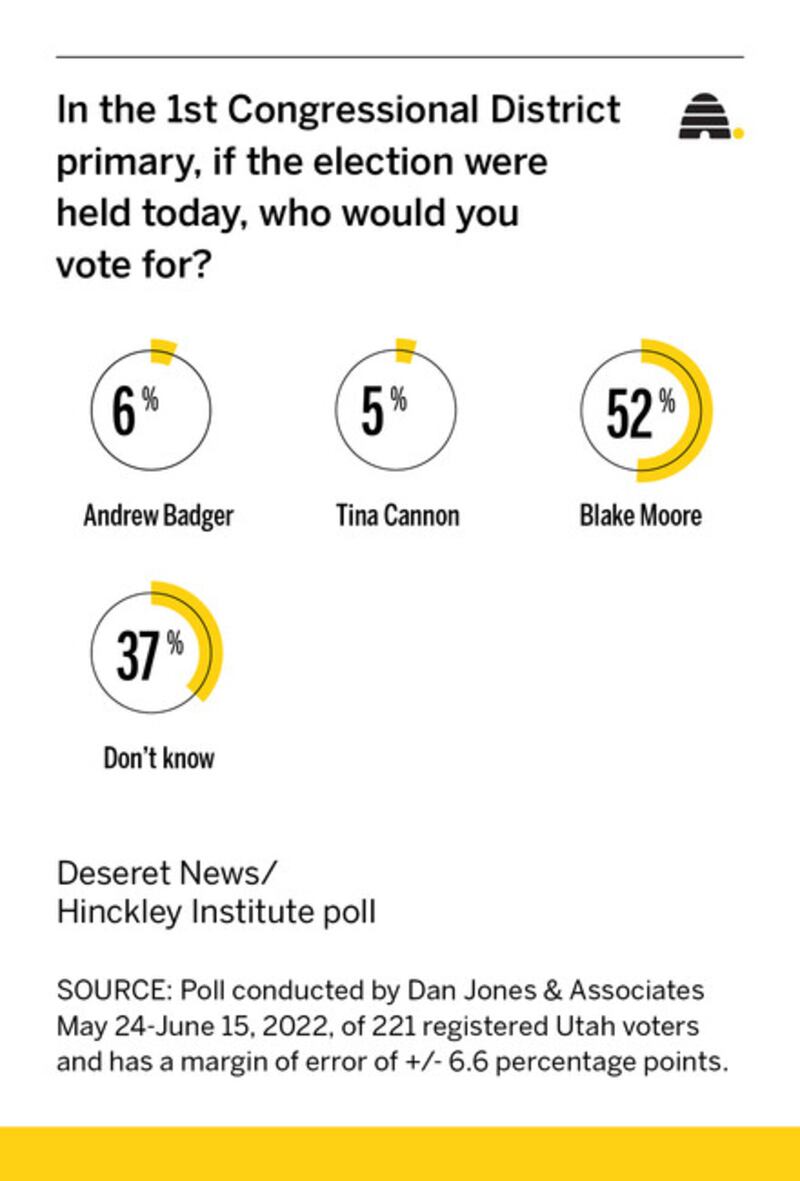 In the 1st Congressional District, freshman Rep. Blake Moore would capture 52% of the vote if the election were held today, according to a Deseret News/Hinckley Institute of Politics survey. Challengers Andrew Badger and Tina Cannon received 6% and 5%, respectively.