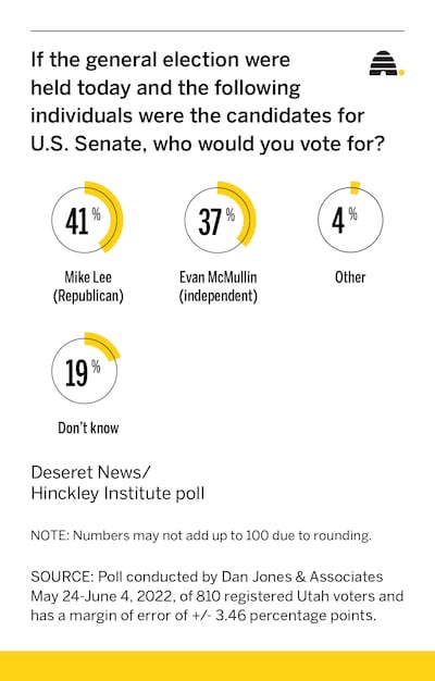 In the poll, 41% of Utahns would vote for Lee and 37% for McMullin in a general election. Another 19% don’t know who they would vote for, while 4% would choose someone else. Two third-party candidates have qualified for the November ballot.