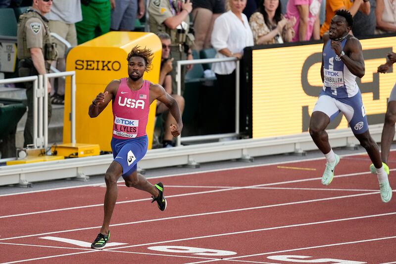 Lyles led at the halfway point and exploded through the finish line with Kenny Bednarek (19.77 seconds) and Erriyon Knighton (19.80 seconds) behind him for silver and bronze.