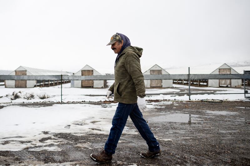 A mixture of snow and muck covered the saturated ground between the rows of wood-framed buildings that house the 2,600 animals at B6 Farms in Lehi. Sleet fell as Contreras, wearing jeans, work boots and a hoodie pulled over his head that hid most of his hair but not his salt-and-pepper mustache, made his way to a barn to repair some pressboard boxes the mink had chewed through.