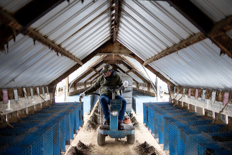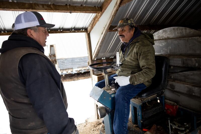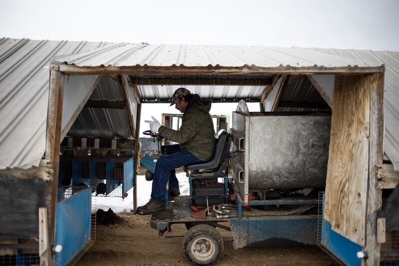 Jesús Contreras slowly drove a mud-splattered feeding machine through a dimly lit shed, dispensing a glob of food atop each wire cage in the mink shed on a recent January day.