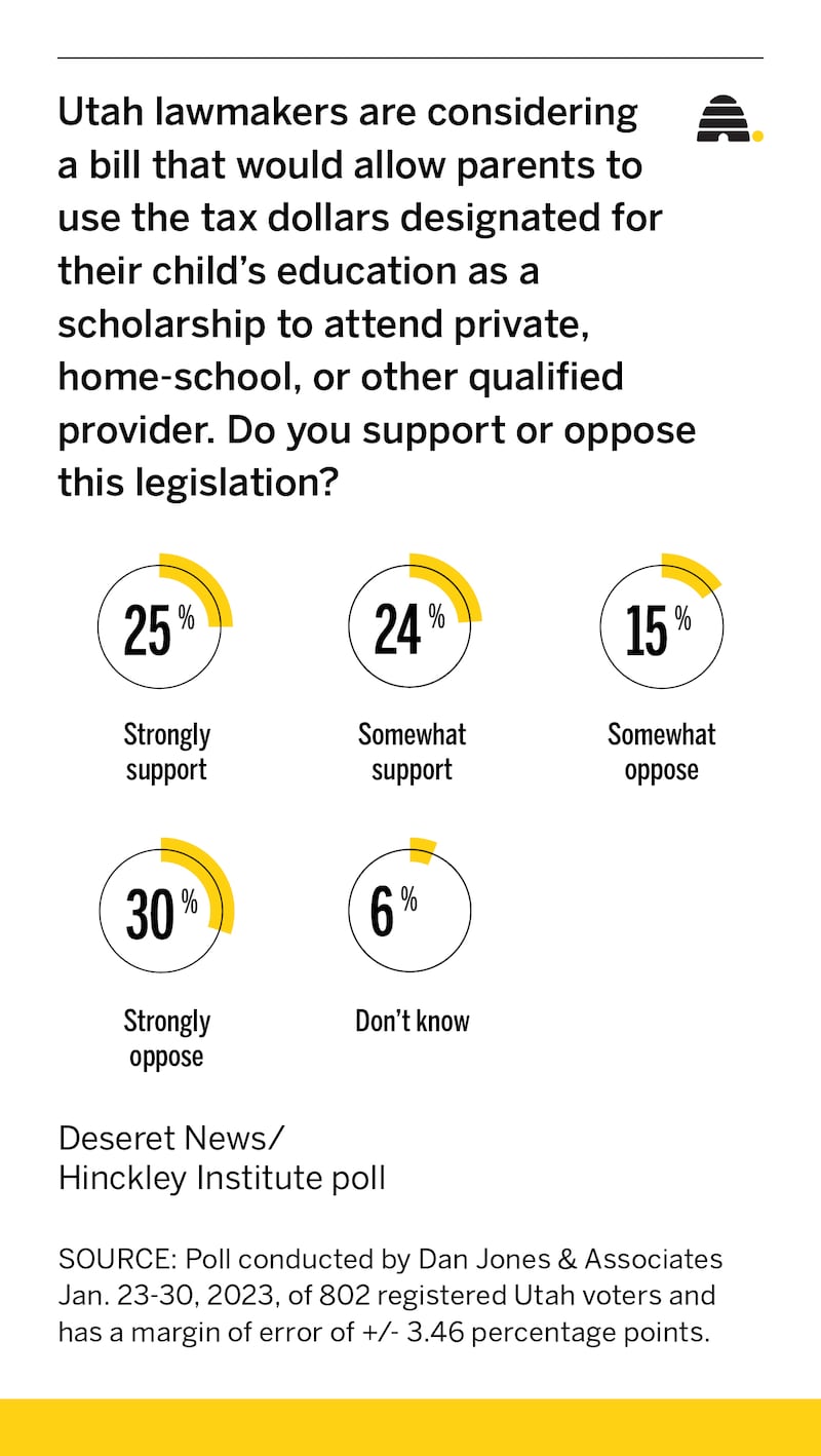 Forty-nine percent of Utahns support using tax dollars for private education options, a new poll conducted for the Deseret News and Hinckley Institute of Politics shows.